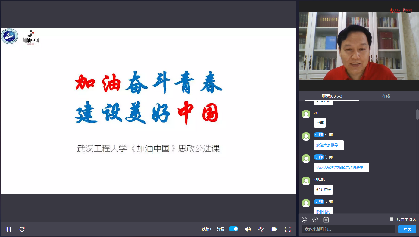 (通讯员 龙晓华)2020年7月4日晚,由长江大学马克思主义学院主办 ,人民网公开课协办,华中科技大学马克思主义学院、湖北经济学院马克思主义学院、武汉工程大学马克思主义学院、湖北科技学院马克思主义学院、黄岭峻工作室及文华在线教育六家单位承办的湖北省第二届“新时代高校思政金课建设”研讨与交流周系列活动之湖北高校“中国系列”思政选修课第四次专题讲座以人民网公开课的方式成功举办。本次讲座的主讲人为武汉工程大学马克思主义学院党委书记、国家精品视频公开课《谁来给中国“加油”——中国石油安全的困境与出路》主讲人、“加油中国”课程负责人舒先林教授,讲座主题为“如何将行业特色融入思政课?——以武汉工程大学‘加油中国’为例”。