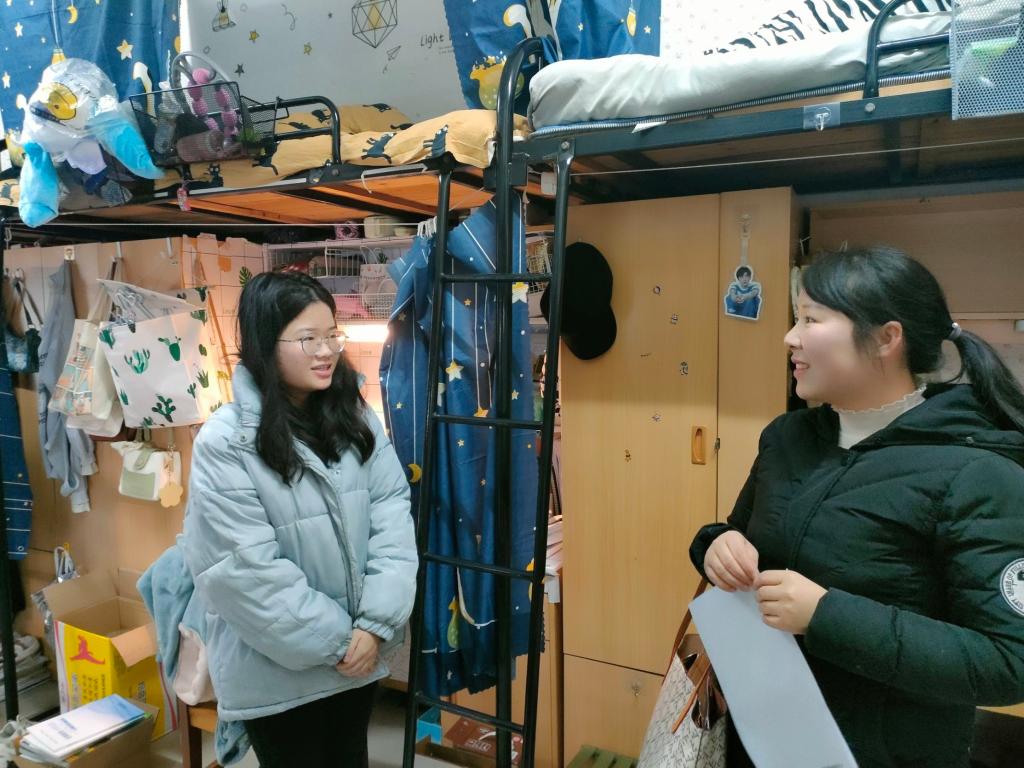 在研究生宿舍,刘小燕书记叮嘱同学们要注意寝室安全和卫生,调整心态更好地投入到学习中,她强调:“良好寝室的氛围要靠大家共同维护。”室友之间要和谐相处、共同进步,建设文明寝室。