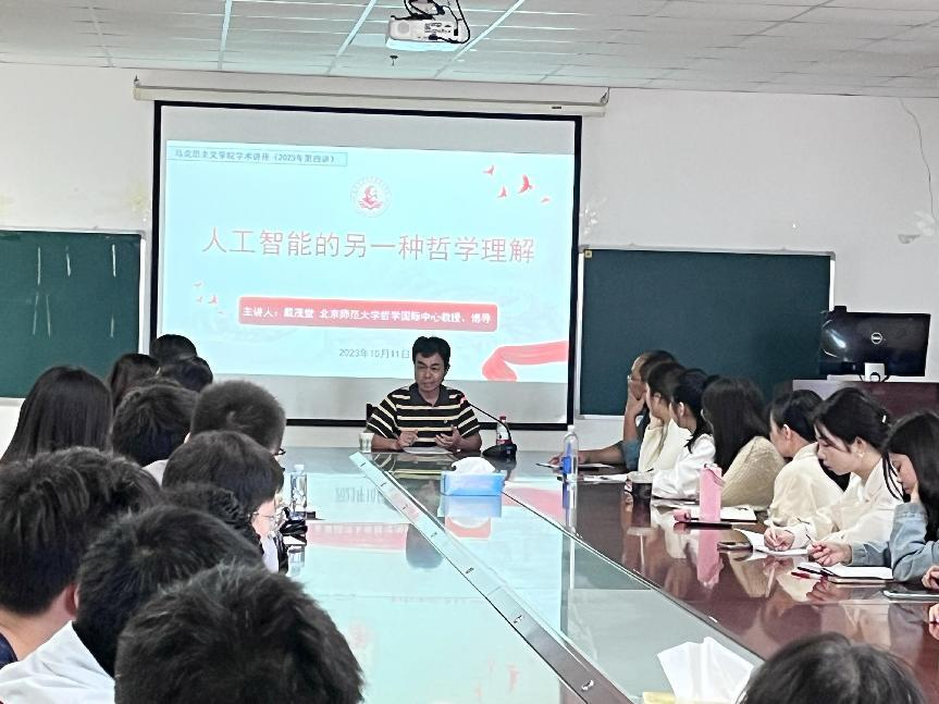 (通讯员 黎娟 王雅云)10月11日上午,我院在文科楼1104会议室举办了“2023年度马克思主义学院系列学术讲座(第四场)”,此次活动邀请到了北京师范大学哲学国际中心教授、人工智能伦理治理实验室主任、博士研究生导师戴茂堂教授,他为我院师生带来了一场题为“人工智能的另一种哲学理解”的精彩讲座。讲座由学院副院长涂江波教授主持。