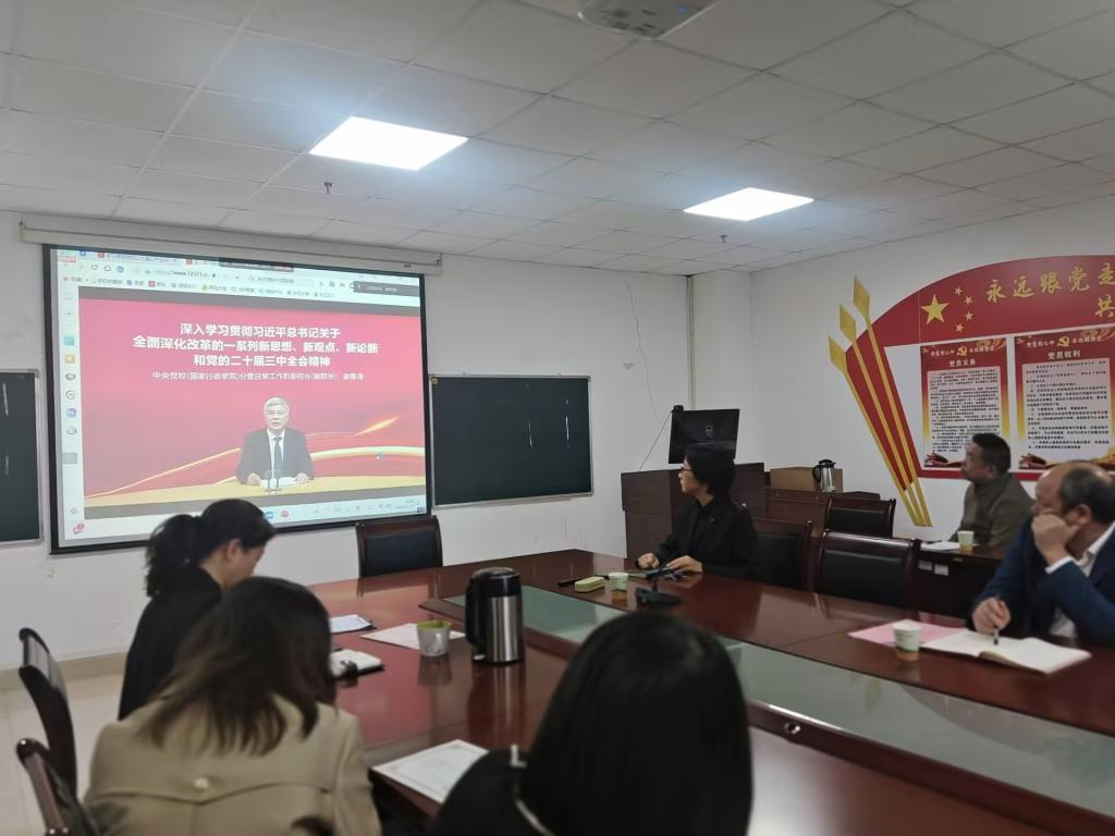 会上大家集体收看学习了“共产党员网”上《深入学习贯彻习近平总书记关于全面深化改革的一系列新思想、新观点、新论断和党的二十届三中全会精神》的视频课,由中央党校(国家行政学院)分管日常工作的副校长(副院长)谢春涛主讲。