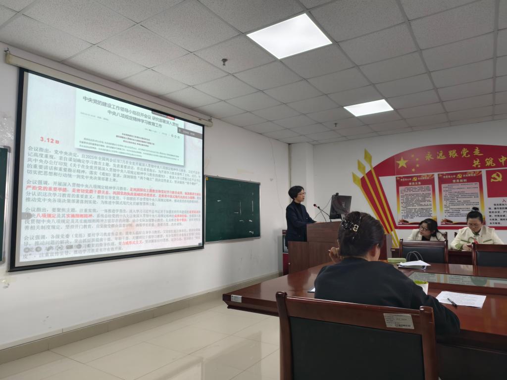 会上,学院党委书记刘小燕领学了习近平总书记关于党政机关习惯过紧日子的重要讲话和重要指示批示精神、习近平总书记关于树立和践行正确政绩观的重要论述、2024年12月9日中共中央政治局会议精神、习近平总书记在中央经济工作会议上的重要讲话精神、习近平总书记考察贵州、云南时的重要讲话精神,传达了第二十八次全国高校党的建设工作会议精神、全国两会精神、2025年全国教育工作会议精神、全省教育大会精神以及第二十八次全省高校党的建设工作会议精神,深入解读了《教育强国建设规划纲要(2024-2035年)》,并就校党委二届六次全体会议、学校2025年工作部署会、校纪委二届五次全会、学校党的建设工作领导小组会议等相关会议精神以及校纪委关于在全校范围内开展《教职工违规打牌和赌博专项整治》、《深入纠治公款旅游问题》等内容进行了集中传达。刘小燕还作了马克思主义学院深入贯彻中央八项规定精神学习教育部署,并讲授了以《作风建设永远在路上——深入贯彻中央八项规定精神学习教育》为题的专题党课。