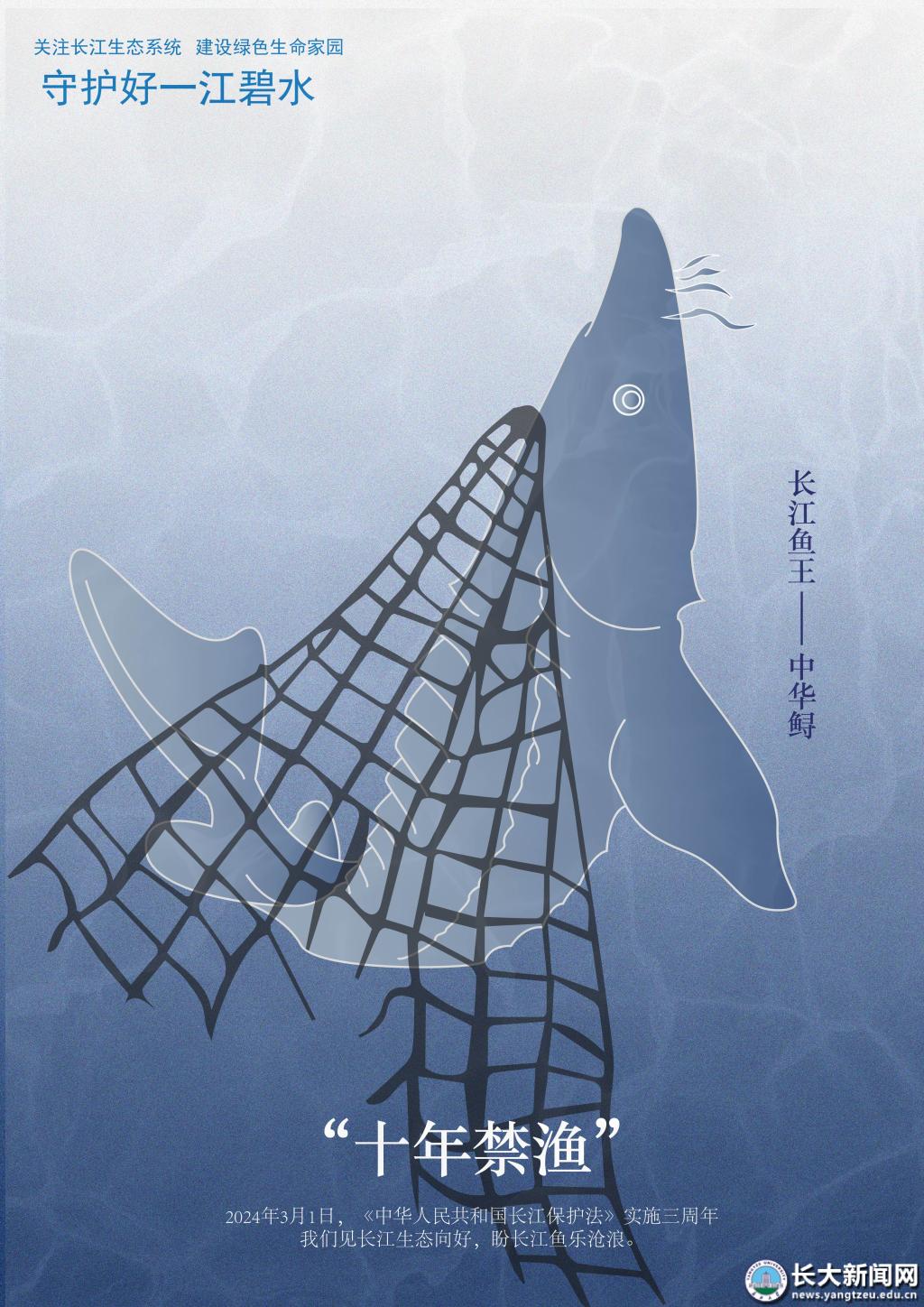该作品由我院2023级研究生王悦悦创作。画面以“长江鱼王”中华鲟挣脱渔网的姿态,纪念《中华人民共和国长江保护法》实施三周年。作品借简洁视觉语言,传递出守护一江碧水,期盼长江生态持续向好,人与自然和谐共生的美好愿景,彰显了青年学子以创意助力生态保护的担当。