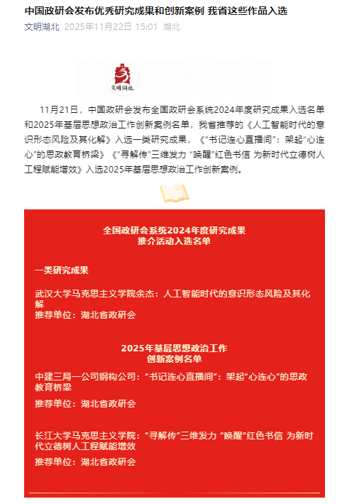(通讯员 方玉卓 徐佳悦 袁田/文 唐佳雨/摄)近日,中国政研会印发《关于公布2025年基层思想政治工作“十佳”案例和创新案例名单的通知》。我院《“寻解传”三维发力“唤醒”红色书信 为新时代立德树人工程赋能增效》案例,入选中国政研会2025年度基层思想政治工作创新案例,系湖北省仅有的两个入选案例之一,也是我省唯一入选的高校案例。