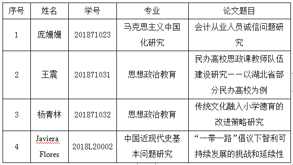 根据长江大学研究生院《关于做好2021年12月硕士、博士研究生学位授予相关工作安排的通知》要求,马克思主义学院2021年12月硕士研究生学位论文答辩安排如下: