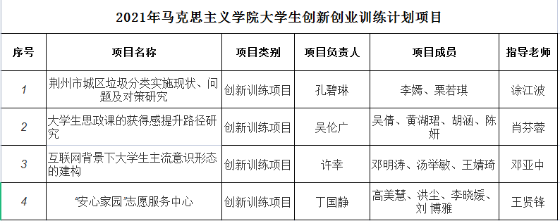 根据学校《关于我校第十四批“大学生创新创业训练计划”项目申报的通知》,以及马克思主义学院《2021年马克思主义学院“大学生创新创业训练计划”项目申报答辩通知》相关安排,通过学生项目申报汇报答辩,专家评审,拟推荐涂江波老师指导的三四线城市垃圾分类可行性研究—以荆州为例》等4个项目项作为校级大学生创新创业项目。现将具体名单公示如下: