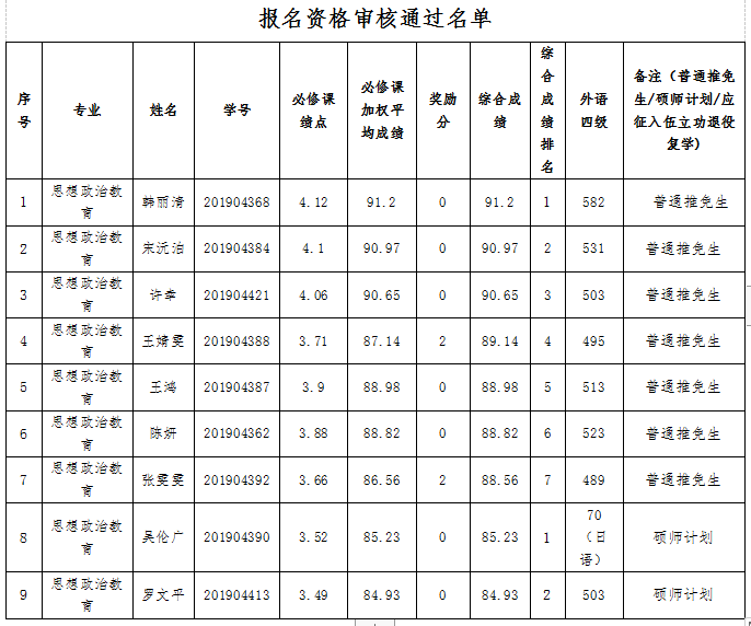 根据学校《关于做好推荐2023届优秀本科毕业生免试攻读硕士位研究生工作的通知》和《马克思主义学院2023届应届生推荐免试攻读硕士研究生方案》要求,经学生本人申报,学院资格审核,学院推免生遴选工作小组审议,现将我院报名参加推免学生资格审核通过名单予以公示。公示时间:2022年9月1日-5日。