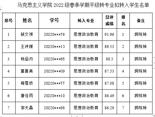 根据教务处《关于开展2022级普通本科生春季学期转专业工作的通知》、《长江大学普通本科生专业分流与转专业管理办法(试行)》(长大校发[2019]260号)和《马克思主义学院2022级本科生春季学期平级转专业考核工作方案》,经学生本人申请,教务处资格审核,我院对通过审核的40名学生进行了面试考察,汇总必修课平均成绩、小论文成绩及面试考核成绩,形成最终录取名单。经学院党政联席会议讨论通过该名单,现将马克思主义学院2022级本科生春季学期转专业拟接收名单予以公示。