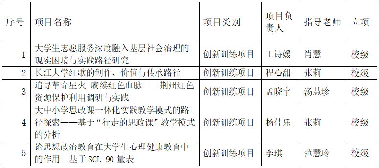 根据学校《关于我校第十七批“大学生创新创业训练计划”项目申报的通知》,以及马克思主义学院《2024年马克思主义学院“大学生创新创业训练计划”项目申报答辩通知》相关安排,通过学生项目申报汇报答辩,专家评审,拟推荐肖慧老师指导的《大学生志愿服务深度融入基层社会治理的现实困境与实践路径研究》等5个项目项作为校级大学生创新创业项目,具体名单见附件。