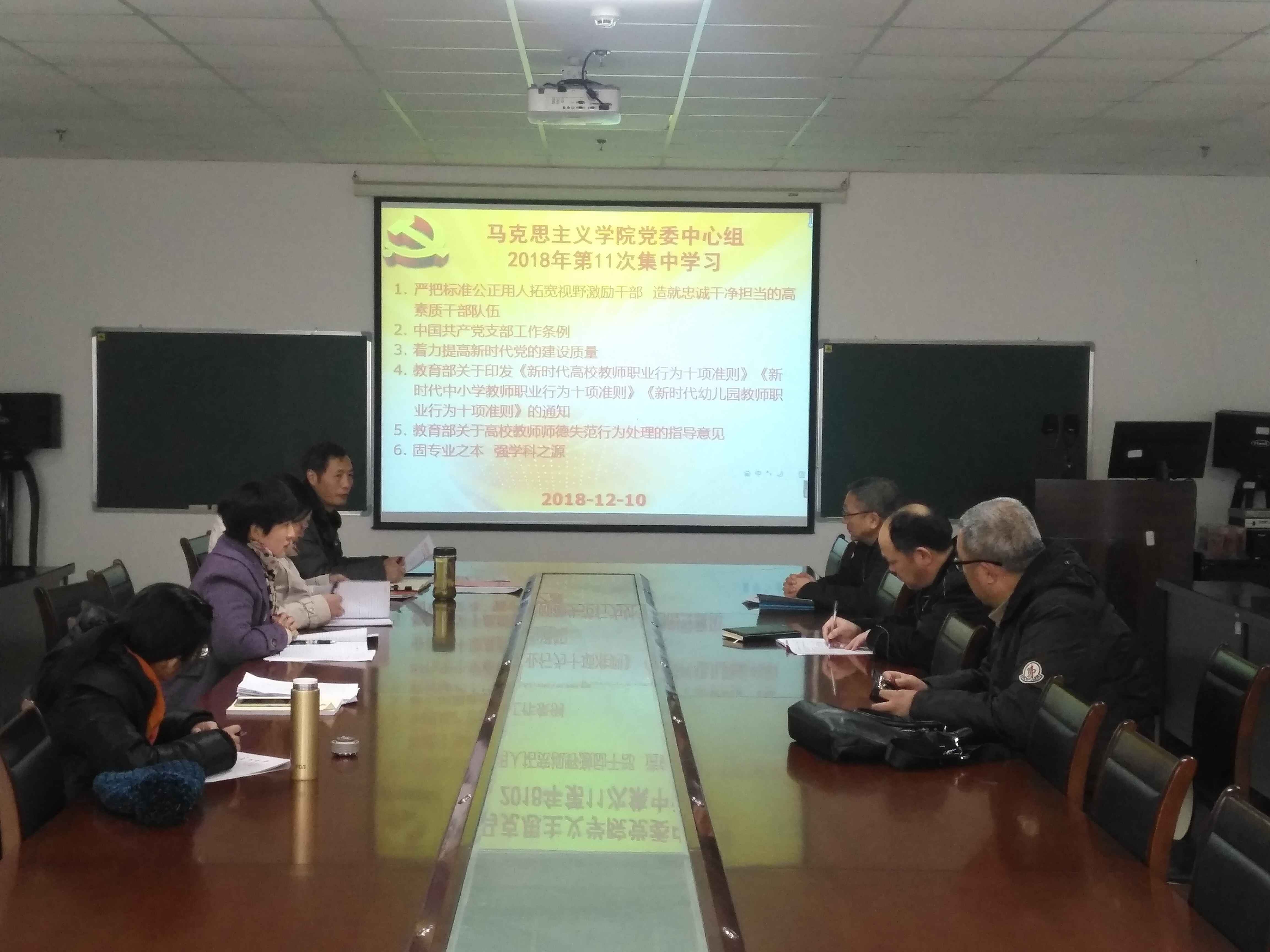 马克思主义学院于2018年12月10日在文科楼1104室举行了党委理论学习中心组第十一次集中学习,党委理论中心组成员及各支部书记参加了学习会,会议由党总支书记吴智勇主持。
