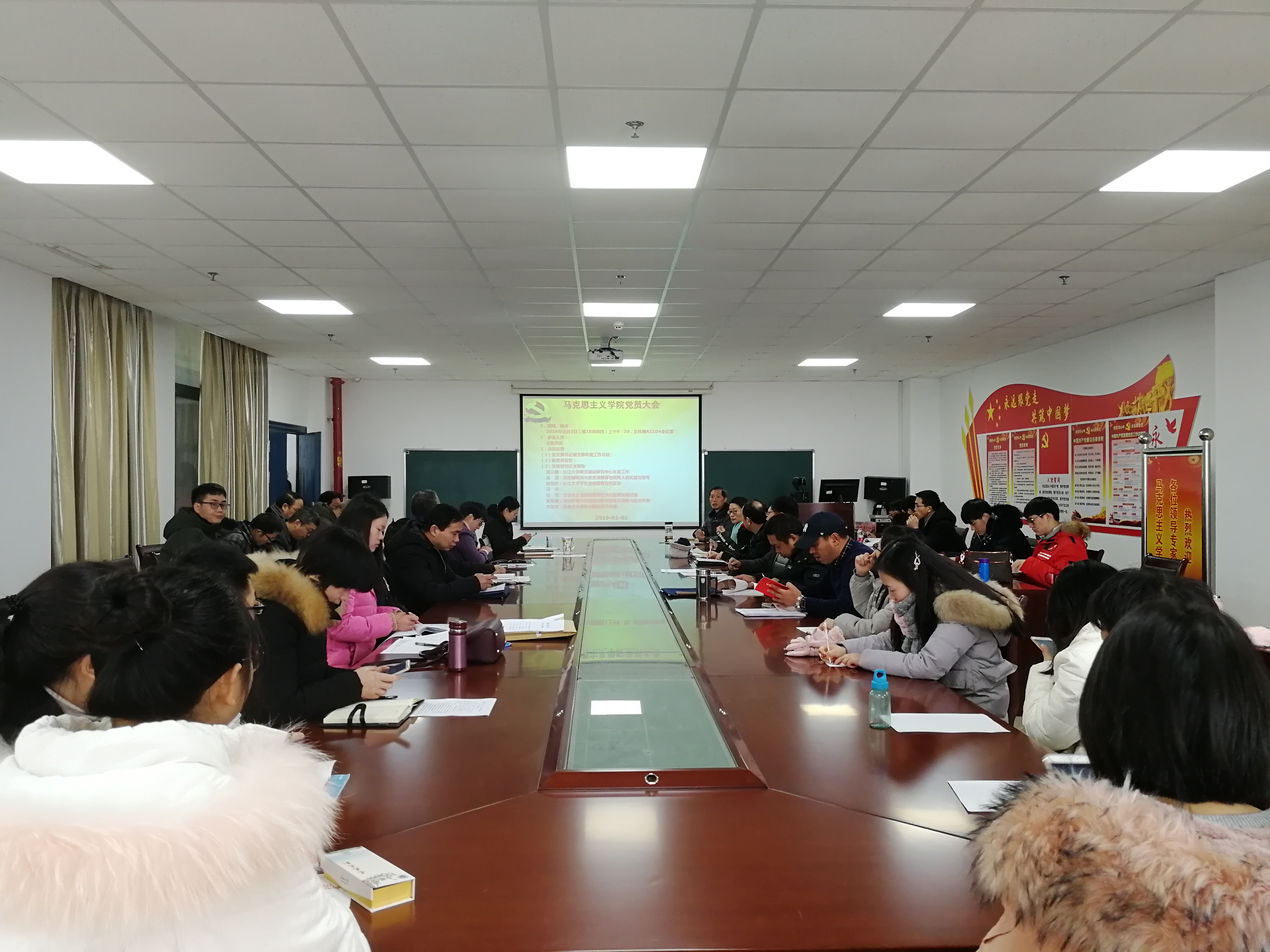 马克思主义学院于2019年1月3号上午十点在文科楼1104会议室召开了全院党员大会。本次会议由马克思主义学院党委书记吴智勇主持。全院教师党员、学生党员参与了本次会议。本次大会分两项,第一项:各支部书记做支部年度工作述职;第二项:新党员宣誓。