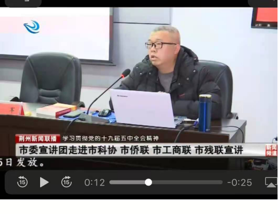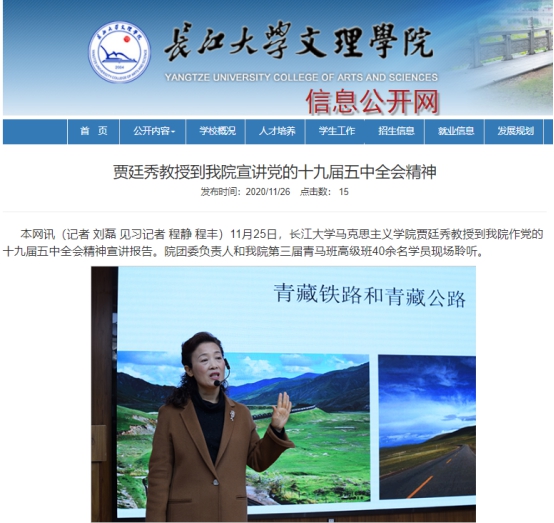 11月5日,学院党委副书记马小佼领学了十九届五中全会公报,全院学生党员、入党积极分子、学习小组成员共同参会;11月8日,学院组织各支部书记参加学校基层党组织书记集中培训,共同聆听了武汉大学项久雨教授所做的《中国道路的未来——十九届五中全会精神解读》;11月10日,学院召开了党委理论中心组集中学习暨党委扩大会,吴智勇书记领学了十九届五中全会精神;11月13日,学院组织开展全院教职工政治学习,全体教师共同学习了全会精神,院长姜学勤为与会人员上了一堂了题为《擎画新蓝图 开启新征程——党的十九届五中全会精神解读》的专题党课;11月12日至11月13日,学院党委书记、院长带头学习了全国教育系统党的十九届五中全会精神宣讲报告会、中央宣讲团成员在湖北高校的宣讲报告;12月3日,校党委书记朱业宏为我院科级以上干部做了十九届五中全会的专题宣讲;12月4日,湖北省委宣讲团成员、武汉纺织大学马克思主义学院院长金艳来校宣讲十九届五中全会精神,全院思政课教师参会;12月10日,荆州市委宣讲团成员、我院涂江波副院长为全院师生宣讲了全会精神。此外,我院贾廷秀、卢军等教师作为荆州市委宣讲团成员,还先后受邀为长江大学文理学院、市科协、市侨联、市工商联、市残联等校内外单位进行了理论宣讲。全院学生也通过“支部主题党日”、主题团会等形式开展了专题学习。