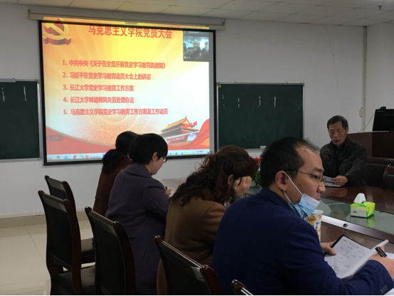 4月8日,马克思主义学院在文科楼1104室召开党员大会,组织开展党史教育专题学习。