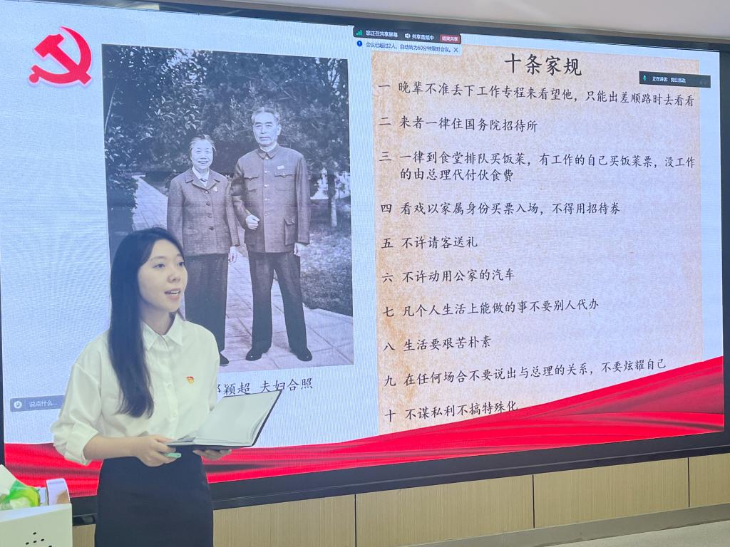 “我志愿加入中国共产党,拥护党的纲领,遵守党的章程…”全体与会党员重温入党誓词过后,活动进入第一篇章“学习党史 知纪于心”。支部书记汤慧珍以“党史上的纪律教育”为题讲授微党课,通过回顾1920年—2024年党的纪律建设历程,结合典型案例并从全局高度阐释了不同历史时期党纪学习教育的意义、内容和特点,引导同学们以史为鉴,更好地弘扬纪律强党优良传统,传承严明纪律的红色基因,争做学纪、知纪、明纪、守纪的表率。支部成员梁芷璐带来的“周恩来的十条家规”红色党纪故事分享,声情并茂,生动感人,引发大家强烈共鸣。马子灏等六位支部党员齐声合唱长征路上人民军队的“铁律之歌”—三大纪律八项注意,烘托出浓厚的党纪学习教育氛围。