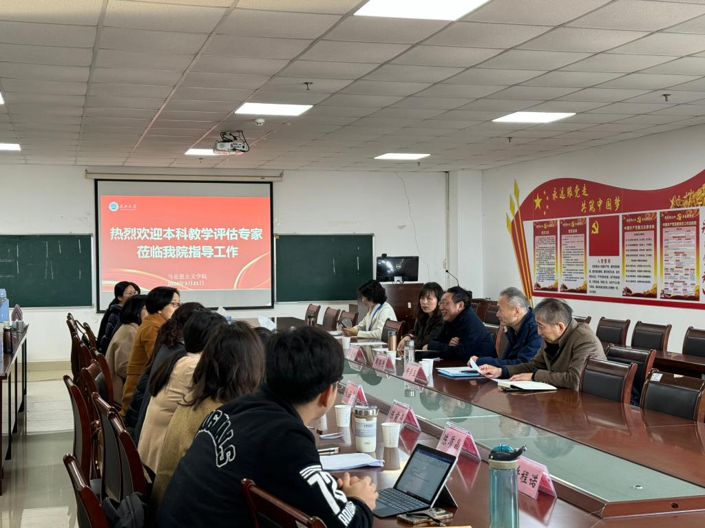 2024年3月21日上午,马克思主义学院本科教育教学审核预评估工作会在文—1104会议室召开。预评估专家组组长潘友刚,成员王诗彦、喻频莲、周存宇、邹学玉等莅临学院,院党委书记刘小燕,副院长涂江波、张莉,副书记汤慧珍,各课程组负责人,各科室主任及教师代表等参加会议。此次预评估工作会旨在全面了解我院在本科教育教学各方面的建设和发展情况,并提供相应的指导和建议。