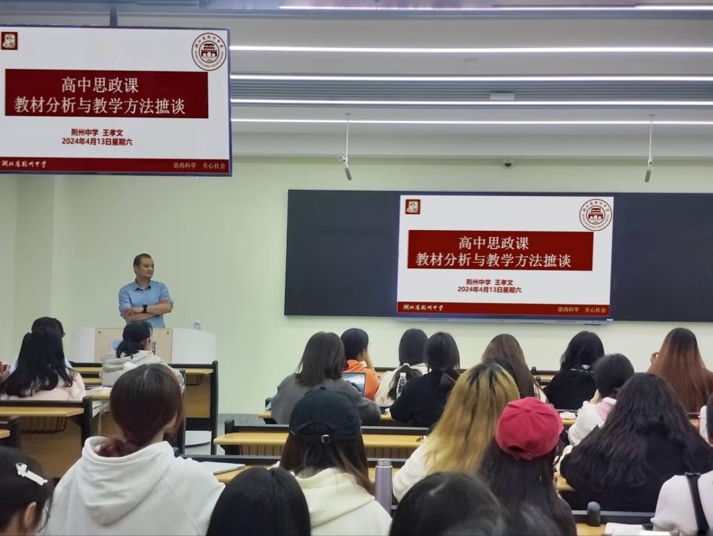 (通讯员:刘若曦)为帮助学生深入了解高中思政课教材与教学方法,4月13日上午,马克思主义学院于16教A312室开展教学论坛第五讲。本次讲座由荆州中学高级教师王孝文担任主讲,学院本科生以及学科教学(思政)专业研究生参与讲座。