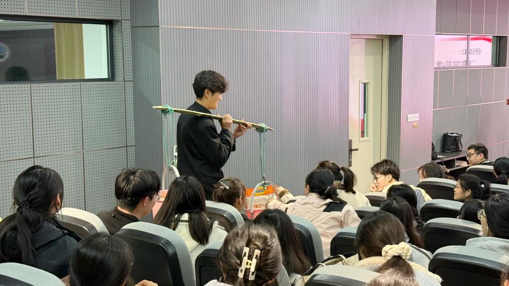 在情景演绎环节,自动化产12301班学生杨耀峰扮演红色交通员吴德峰,架起扁担体验红色交通员运送物资的艰辛。尹家荣、高宇桐深情演绎了李白和裘慧英因革命事业而假扮夫妻扎根在敌后战场开展情报工作的英勇事迹,中国共产党人英勇无畏、舍生忘死、奉献一切的革命情怀在这堂思政课上具象化。