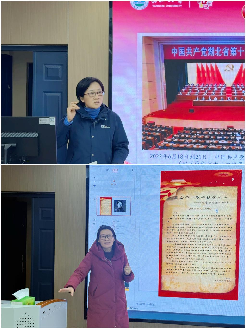 备课会以“说课”的形式开展。课程组陈前燕、陈质晶、饶玲、刘小燕、张莉分别就“无声的功勋—隐蔽战线的无名英雄”、“百年风华 青春对话”、“觉醒年代里的父母爱情”、“伟人信物中的荆楚情”、“抉择”专题,从书信选取、课程内容、教学设计等方面作教学展示。涂江波、肖芬蓉等课程组教师立足课堂教学、各抒己见,充分表达教学设想。老师们的教学展示各具特色,引经据典,将知识点渗透于案例中,穿插师生互动讨论环节,体现了“合作、探究、互动、评价”的教学模式。
