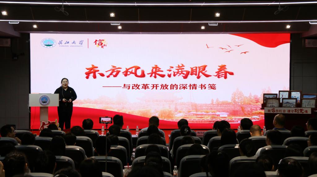《信·荆楚》第七讲“东方风来满眼春—与改革开放的深情书笺”由马克思主义学院青年教师孙萌和国家级荆州经济技术开发区滩桥镇党委副书记唐王维联袂讲授,课程通过深情讲述、信物分享、情景演绎、红歌合唱等丰富形式解读荆州改革开放中的信物及书信。