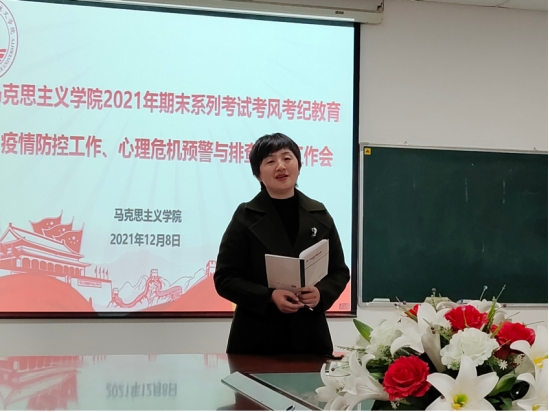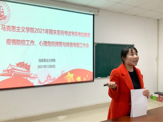 (通讯员、摄影:齐晓杭)12月8日下午6时,马克思主义学院在文科楼1104室召开期末系列考试考风考纪教育及疫情防控工作会议,本次会议由学工办主任张云雾主持,学院党委副书记马小佼、辅导员李敏出席会议。本研各班级的班长、团支书、副班长兼安全委员、心理委员及学生会、研究生会主要成员到场参会。