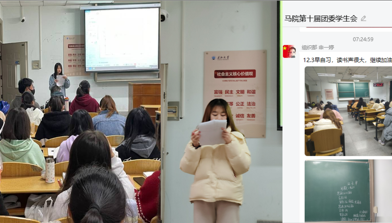 (通讯员 王晓彤)为进一步加强院风、学风建设,营造浓厚的学习氛围,帮助大一新生养成良好的学习习惯,马克思主义学院实行大一新生早、晚自习及课堂考勤管理方法。入学至今,学院领导老师和学生干部齐心协力,密切配合,同抓共管,学风建设取得了实质性进步,“学思践悟,守正创新”在学院内蔚然成风。
