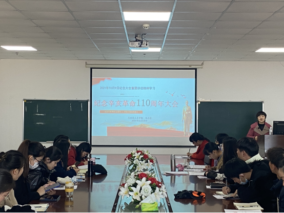 (通讯员 汤举敏)2021年11月25日上午,马克思主义学院在文科大楼1104室召开了以“学习习近平总书记在纪念辛亥革命110周年大会的重要讲话精神”为主题的学习活动,院党委副书记马小佼老师、辅导员张云雾老师和学习小组全体成员参加了本次学习活动。