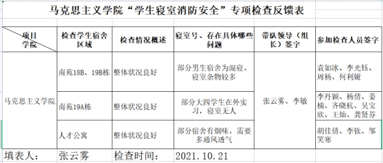 (通讯员:郜越)为了营造学生宿舍安全、卫生、整洁、健康的生活环境,2021年10月21日下午,马克思主义学院组织开展了冬季学生宿舍消防安全检查。本次检查由年级辅导员张云雾、李敏老师带队,学生会和研究生会生活部及部分寝室长参与了自查。本次消防安全检查覆盖了全院本、研学生寝室。