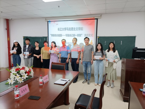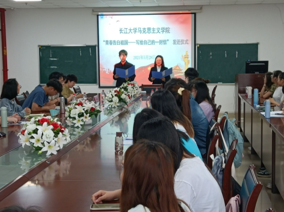为庆祝中国共产党成立100周年,抒发学生的爱国爱党情怀,马克思主义学院于2021年5月28日在文科楼1104室举行了“青春告白祖国—写给自己的一封信”交还仪式。学院党委书记吴智勇、副书记马小佼、2019级本科生导师代表张志超副教授、辅导员李敏、辅导员张云雾老师以及全体2019本科生参会。