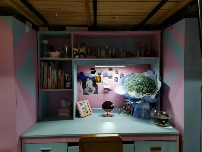 继续走进去深入探索也是惊喜连连,同学们把不大的寝室装饰的充满生活气息和人情味,行李多而不乱,寝室空气清新怡人,夹杂着淡淡的清香浸人心脾;屋顶有气球装饰、贴纸装饰和灯光装饰;墙壁被划分了绘画墙、照片墙、安全墙和留言墙等区域;桌面床铺有玩偶、鲜花、收藏品和时令水果装饰,搭配桌布温柔的台灯灯光使人心情愉悦,清爽又养眼;书架上摆着的《共产党宣言》《习近平谈治国理政》满满都是马克思主义学院的浓厚文化学术氛围。
