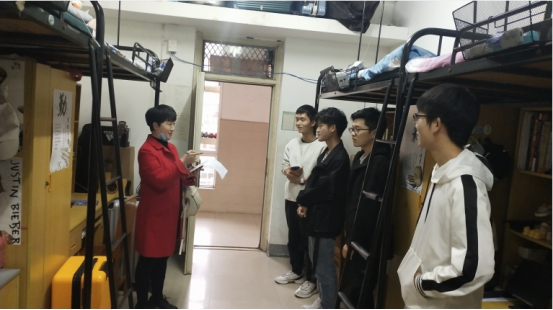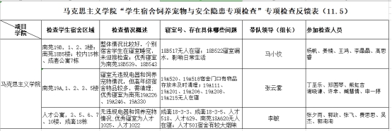 根据学工处《关于开展2020年冬季学生宿舍饲养宠物与安全隐患大检查的通知》要求,马克思主义学院于11月5日下午16:30组织开展了学生宿舍大检查工作,副书记马小佼、辅导员张云雾、辅导员李敏分别带领学生干部检查了位于人才公寓、南苑18栋、19栋,校内成套公寓的全院本、研学生寝室,重点检查了饲养宠物与安全隐患情况,关心学生学习、生活状况。学院各宿舍寝室卫生状况良好,无饲养宠物等违规行为,学生精神面貌良好。