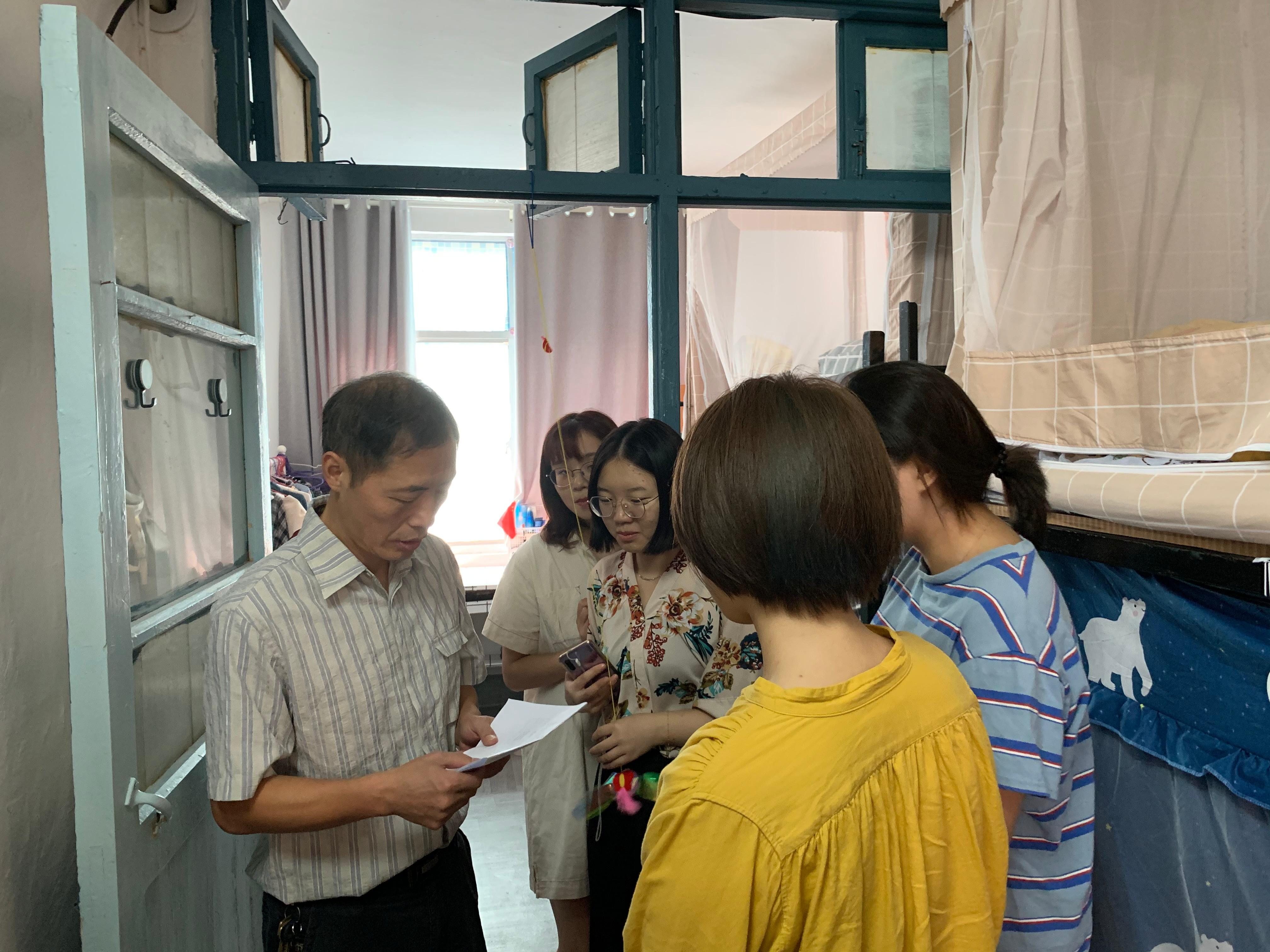 为了进一步提高学生们的安全防范意识,同时创造良好的生活环境,2019年9月27日上午马克思主义学院党委书记吴智勇、兼职辅导员董思遥,来到研究生寝室进行安全隐患排查以及卫生大检查。