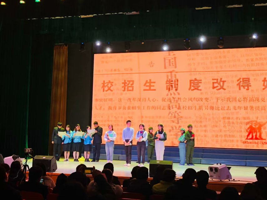 决赛现场,经过层层选拔和反复遴选,我院的陈雅文和梁嘉怡从学院的初赛和学校的复赛中脱颖而出。依据她们所选的参赛诗歌《相信未来》为主题,分别以1935年、1949年、1978年、2018年为故事背景生动再现了各时代背景下青年爱国的故事。