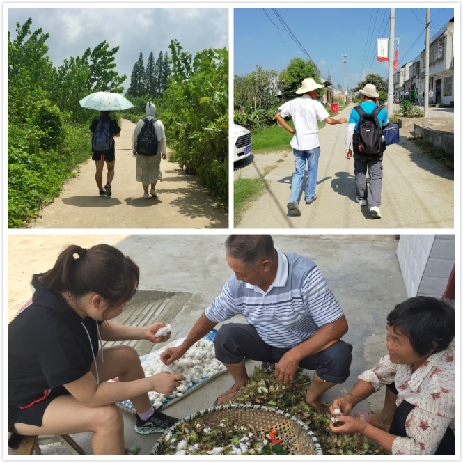 在经过简单地休整之后,实践队再次出发。这次实践队分成两组,从不同方向对附近村落展开调研。虽然是下午,但依旧烈日当空,高温也未曾消减。队员们徒步进户,与当地老百姓交流聊天,受到了老百姓的热情接待,在关注农村生态文明建设的同时也留心新时代农民所面临的重大困难。