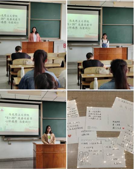 我院紧扣5月20日“我爱你”、5月25日“我爱我”寓意,通过明信片记录爱,大声说出爱,电影感悟爱,行动传递爱等丰富多彩,师生喜闻乐见的形式倡导学院学生关爱同学、关爱自身身心健康;鼓励学生向亲人表达感恩之情,汇报生涯规划;推进师生“1+1”特色导师育人制”资政育人工作。习近平总书记曾多次勉励青年人要勤学修德明辨笃实,成长为有“大爱大德大情怀”的时代新人。诚然,从爱自己、爱同学、爱家人开始,推而广之爱家乡、爱祖国、爱人民是从小爱到大爱的升华。毫不吝啬的大声说出爱,思政学子的眼中有星光,心里有大爱。