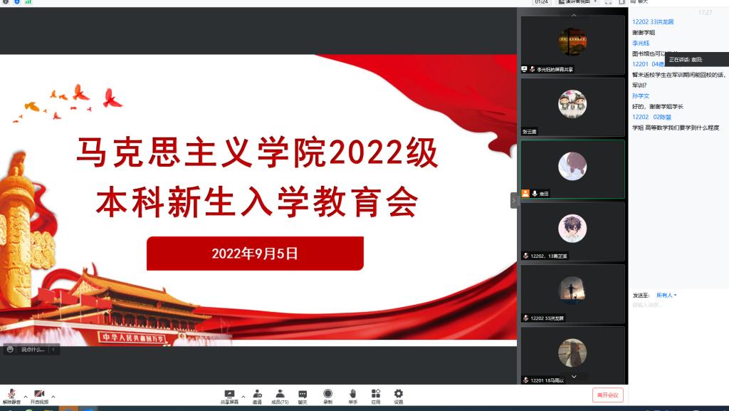 随着迎新工作的圆满结束,马克思主义学院新生入学教育系列活动也拉开了序幕。9月5日上午,我院通过腾讯会议召开了2022级本科生线上见面会,全体辅导员、全院本科新生共同参会。会上,辅导员张云雾结合校史校情宣讲了学院的发展历史、办学情况,开展了疫情防控安全教育,团委书记李敏介绍了学院共青团工作,党委副书记马小佼勉励新同学:希望同学们在新的人生起点学会适应、学会自律、学会规划;希望同学们遵守校纪校规、关注生命安全,珍惜大学时光。随后,新生从个人基本情况、未来规划等方面进行了自我介绍,将活动推向了高潮。当日,新生们还自学了疫情防控政策,以宿舍为单位观看防诈骗教育视频,由学长学姐领学了学校的规章制度,将安全文明教育落到了实处。