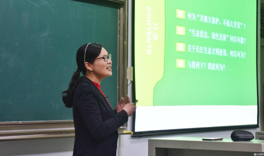 “何为‘共抓大保护,不搞大开发’?”“‘生态优先、绿色发展’何以可能?”“关于长江生态文明建设,何以可为?”“与我何干?我欲何干?”肖芬蓉老师从四个方面对长江生态文明建设进行了深入讲述。