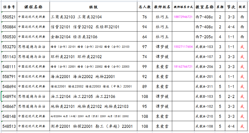 1. 认证小组成员对我院每位申请认证的青年教师进行听课,听课评议统一按《长江大学教师课堂教学质量评估表》进行,不得漏评。对本组每位青年教师听课不少于1小节课(对武汉校区的两位老师可进行线上听课,专家提前联系老师获取课堂邀请码,如果参加认证的青年教师讲授的课程不止一门,认证小组专家可随机听课,不限于只听其中某一门课程。我院参加本次青年教师教学水平认证的人员开课信息如下: