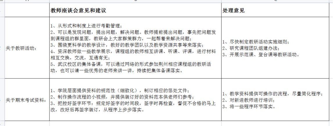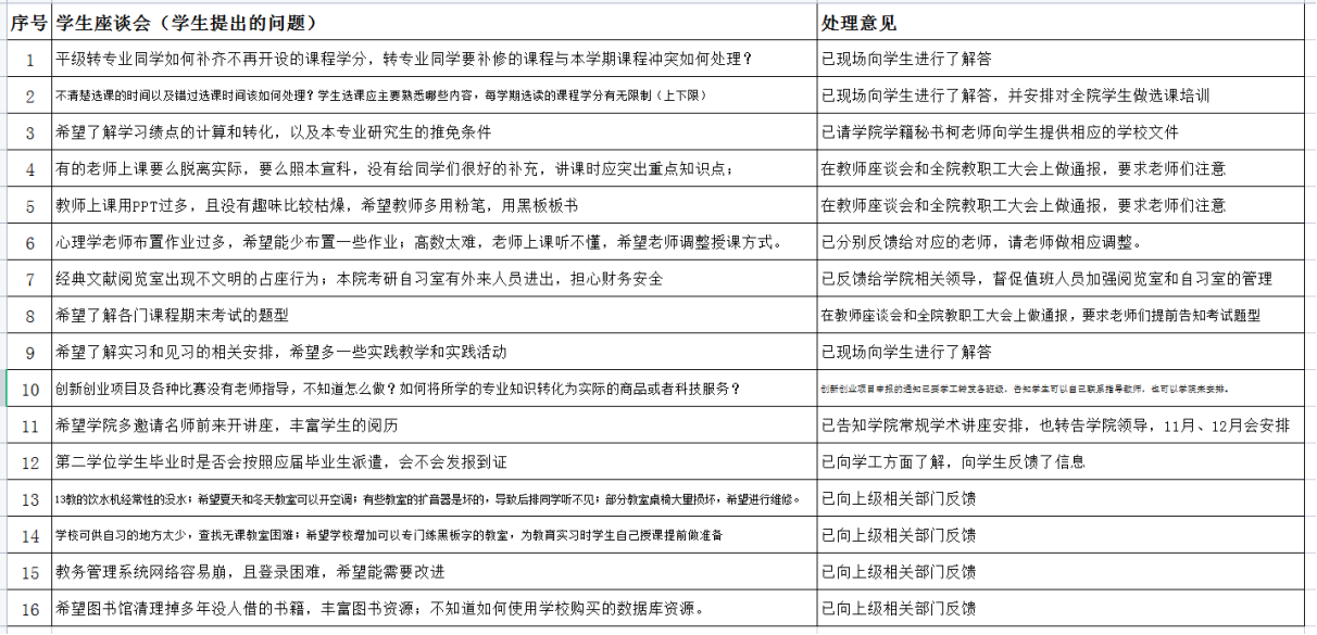 认真组织教师和学生座谈会,听取参会代表所搜集到的教学管理方面的意见和建议,两个座谈会均由教学院长助理李振华老师主持,会后学院对师生反映的问题和建议进行了分析、反馈,并提出了相应的整改措施。具体情况见后面的附件1和附件2.
