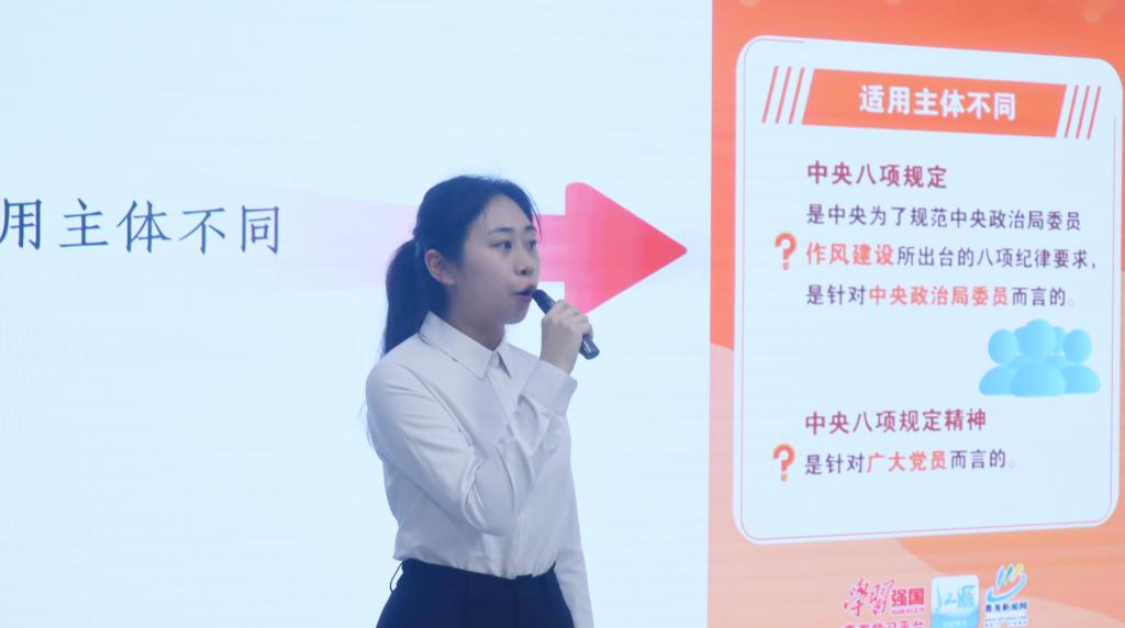 “职位越高越要简朴,党的经费一分一厘都不能乱花!”吴宇洁以“信纸上的纪律刻度”为题讲授微党课。在她的深情讲述中,发生在老一辈无产阶级革命家董必武身上的一则则廉洁小故事,犹如历史明镜,照见共产党人“公私分明、克己奉公”的政治品格,与中央八项规定“严禁利用职权谋私”之要求形成跨越时空的共鸣。