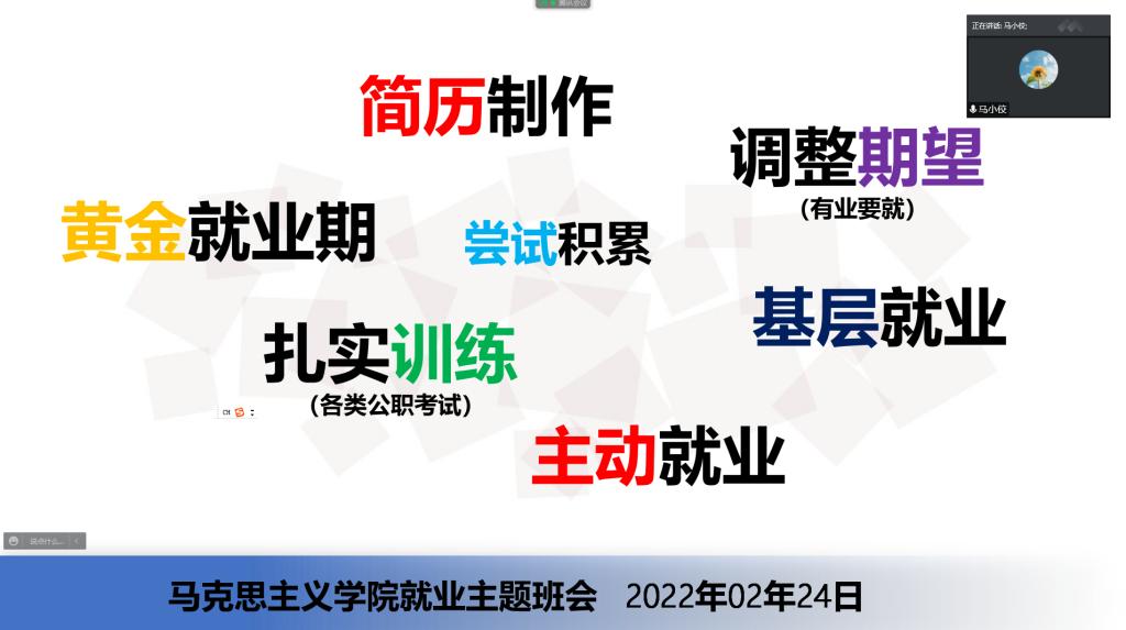 李敏对荆州市招硕引博政策进行逐条解析,同时对人才引进的流程、报名时间、条件等进行了强调,呼吁同学们重点考虑,抓住机遇,积极报考。李敏也对2022年就业工作进行了动员。他从就业规模、就业环境、就业观念、主要挑战等方面对当前就业形势进行了解读,并建议同学们抓住就业“黄金期”,打磨简历,扎实训练,尝试积累,调整期望,主动就业。