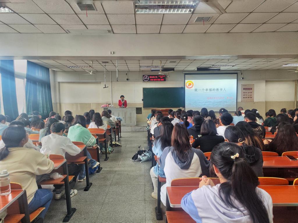 讲座伊始,黎九香老师从自身的工作经历与教学经验出发,以生动有趣的小故事形式讲述了她做班主任的经历。“爱是最无声的语言,也是最有效的催化剂。”黎九香老师告诉同学们,做一名教育人最重要的就是有一颗爱心和宽容心,用心关爱学生,用爱感化学生。随后,黎老师指出:当我们用心感悟教育事业时,当我们尽心尽力、无愧于“老师”这个称呼时,纵然我们不刻意追寻快乐与幸福,真正的快乐与幸福也会常驻我们心中。其次,黎老师希望同学们在拥有远大理想的同时,既要放眼未来,又要着眼当下,在未来的一个个人生阶段,随时保持整装待发的姿态,全力以赴奔赴自己的高山之巅。